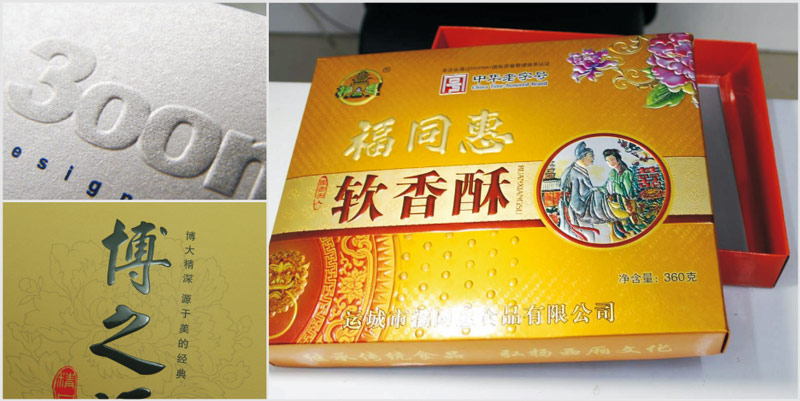 又稱壓紋工藝,使印刷品凸顯各種圖文和花紋,具有明顯的浮雕感,增強(qiáng)印刷品的立體感和藝術(shù)感,使包裝制品的外觀在藝術(shù)上得到更完美的體現(xiàn)。